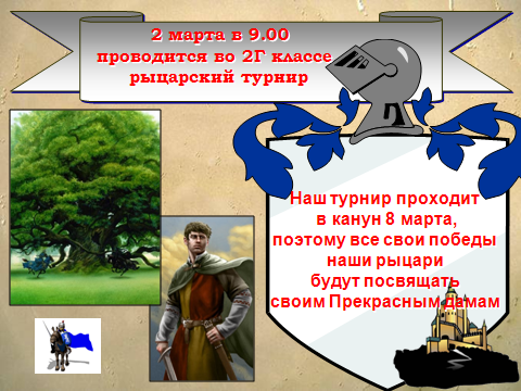 План подготовки: 1) приготовить костюмы кому назначено мальчикам, а девочки готовят костюмы "прекрасных дам"; 2) выучить слова к празднику; 3) конкурс сочинений "Рыцарь в наши дни" (сочинения будут даны в качестве д/з во вторник по чтению на четверг; их нужно будет оформить красочно на альбомных листах - они будут украшением на классной доске); 4) необходимо украсить класс соответствующе; 5) родительскому комитету приобрести призы для поздравления. ![]() | |